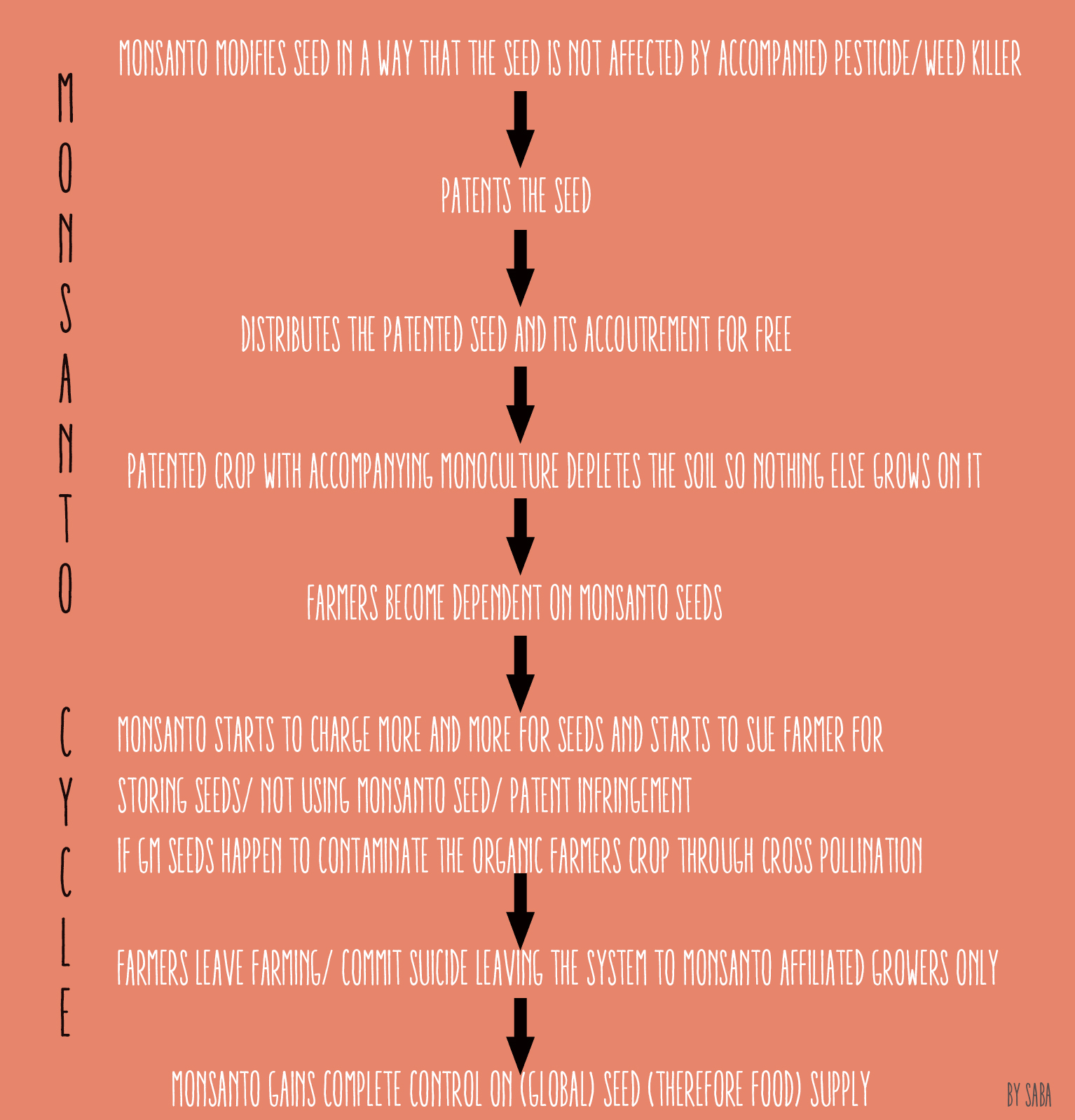 Monsanto is the corporation that conceived and implemented the concept of patenting seeds, genetically modified(GM) seeds. As farfetched as it seems, Monsanto uses genetic engineering in an effort to control world’s agriculture and food supply. This is the same Monsanto that declared “Monsanto should not have to vouchsafe the safety of biotech food. Our interest is in selling as much of it as possible”. Monsanto is the company that claimed products like PCB or agent orange or DDT are safe that were used later in herbicidal warfare or banned as persistent organic pollutants. Remember the mass farmers’ suicide in India? It was Monsanto. Here’s a simplified pictogram describing Monsanto’s intricate scheme, as clearly as I could gather: